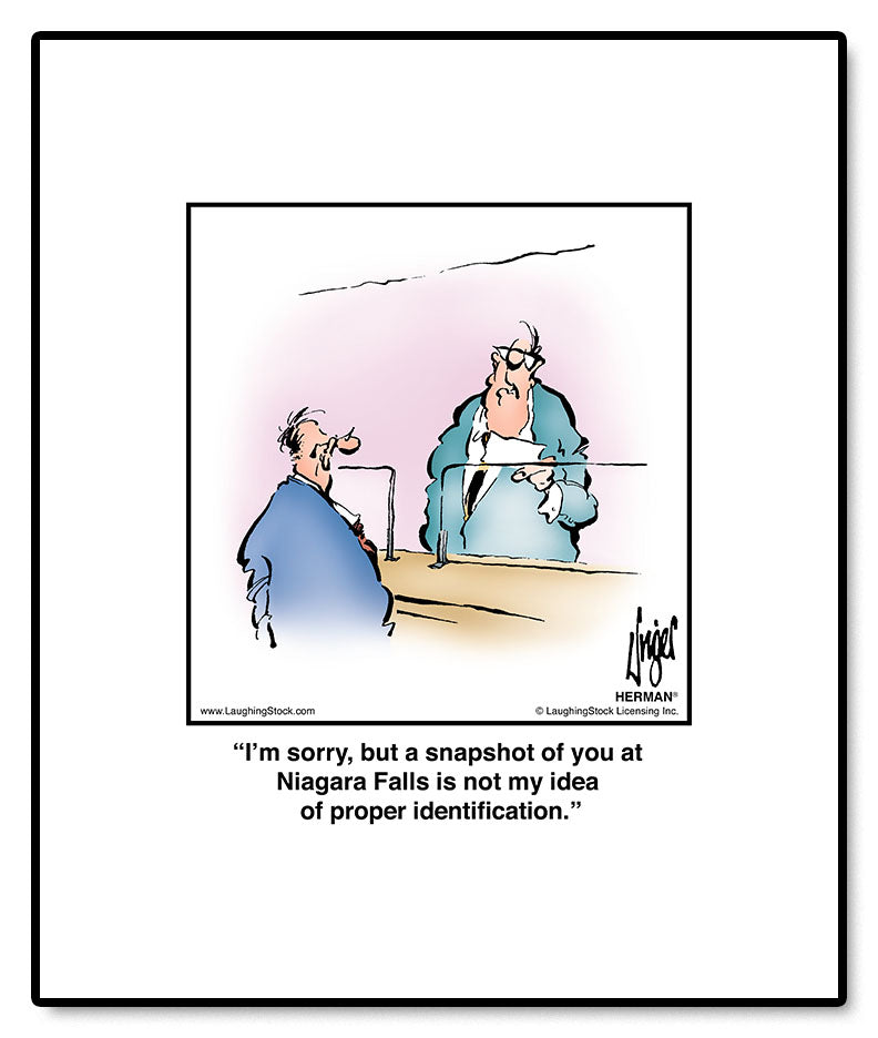 I’m sorry, but a snapshot of you at Niagara Falls is not my idea of proper identification.