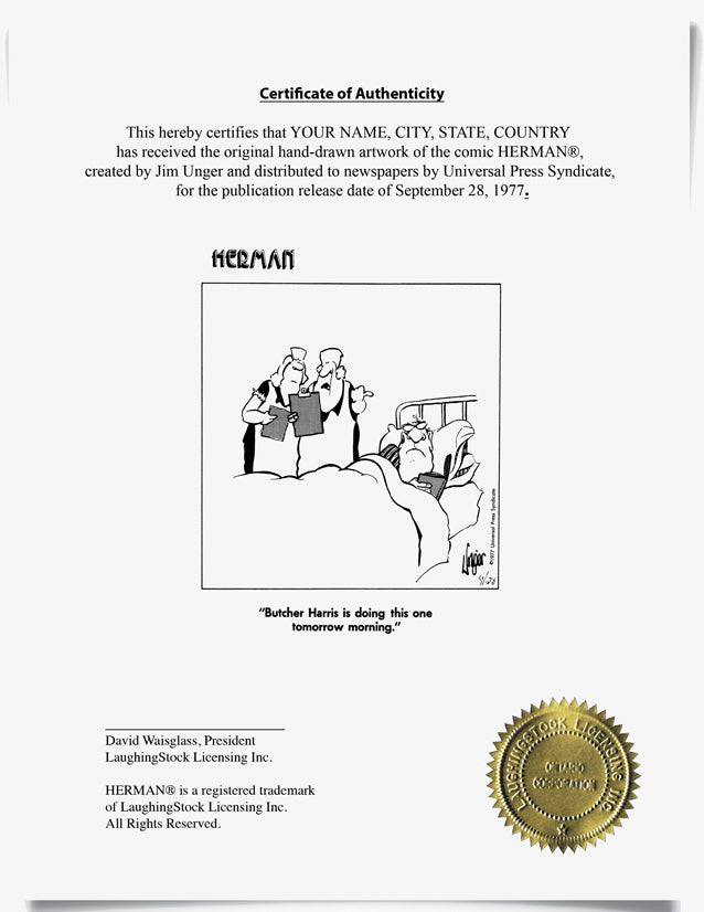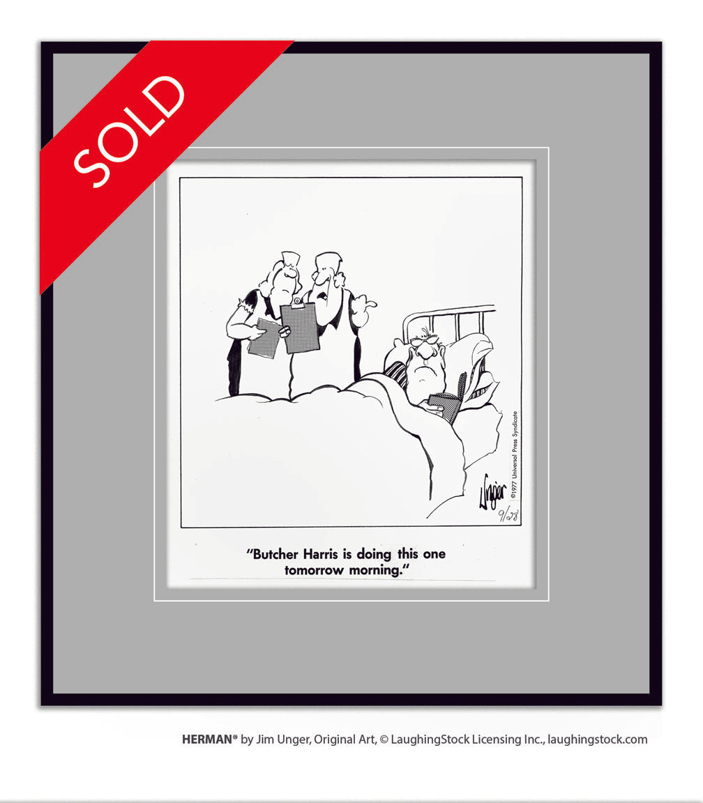 The original penned drawing by award-winning HERMAN comic creator Jim Unger. Unger would submit the drawings to Universal Press Syndicate for daily distribution to newspapers around the world. The copyright year and the date of release is written inside every comic panel. The comic would be published again in best-selling book collections by Andrews McMeel Publishing.